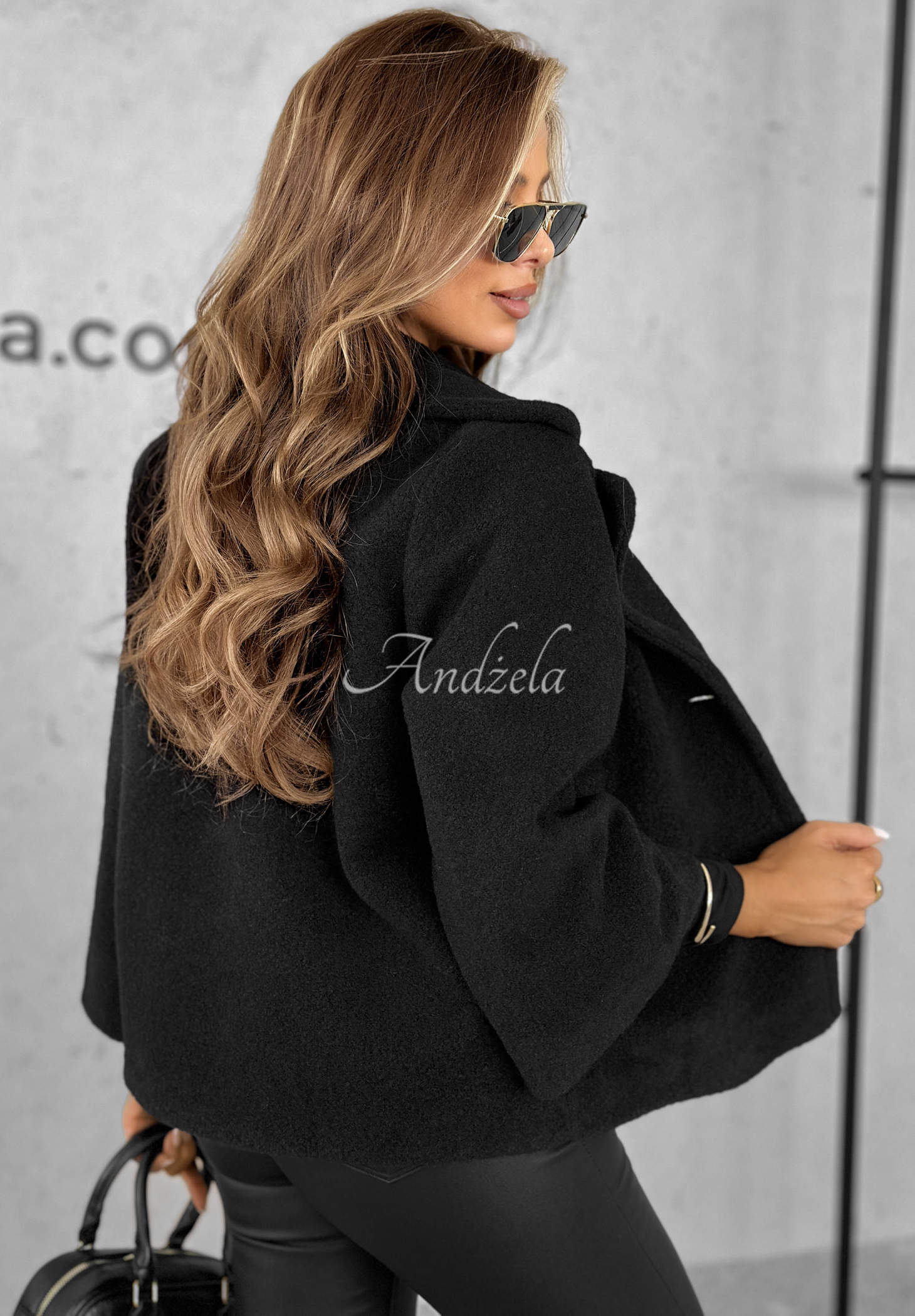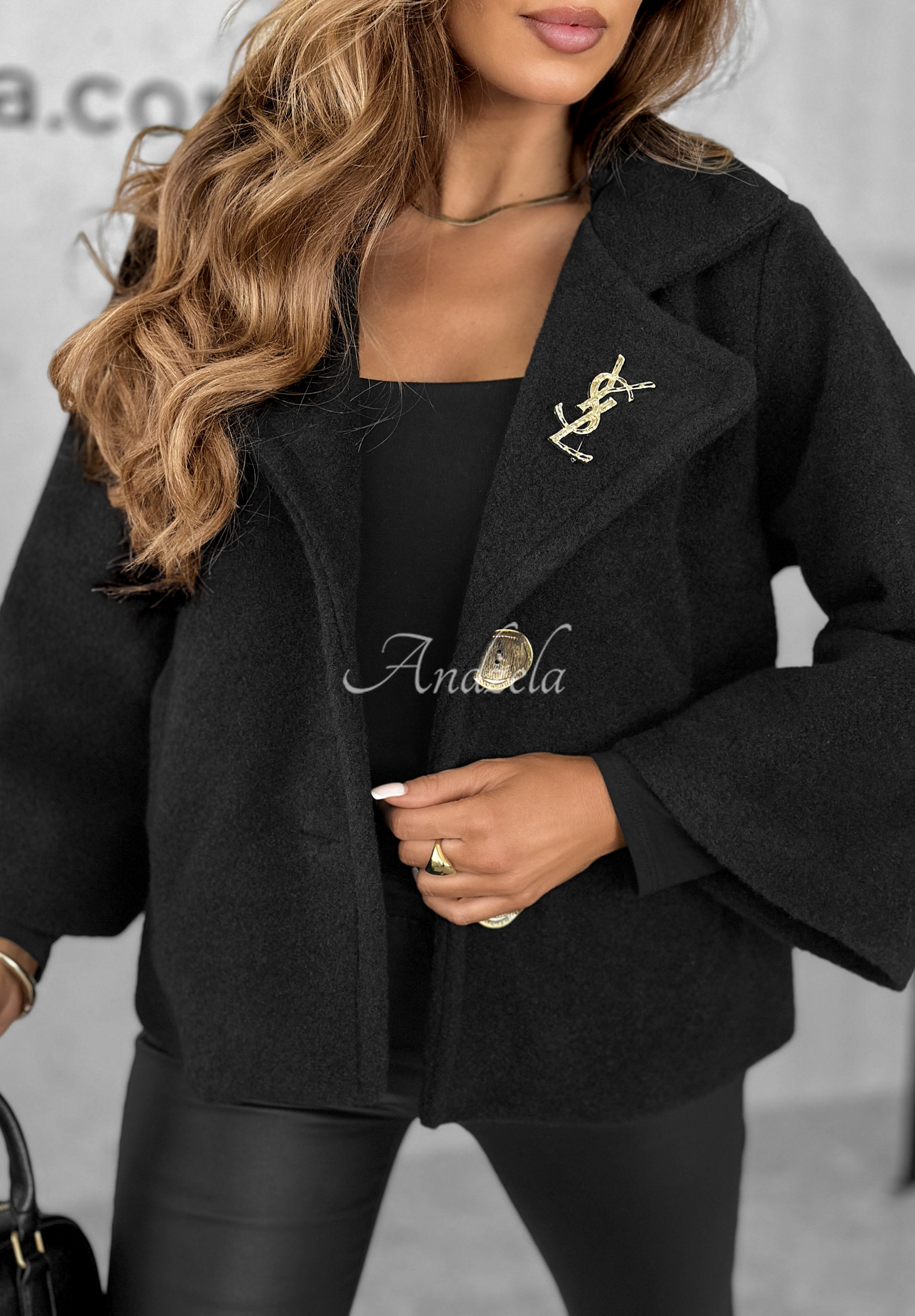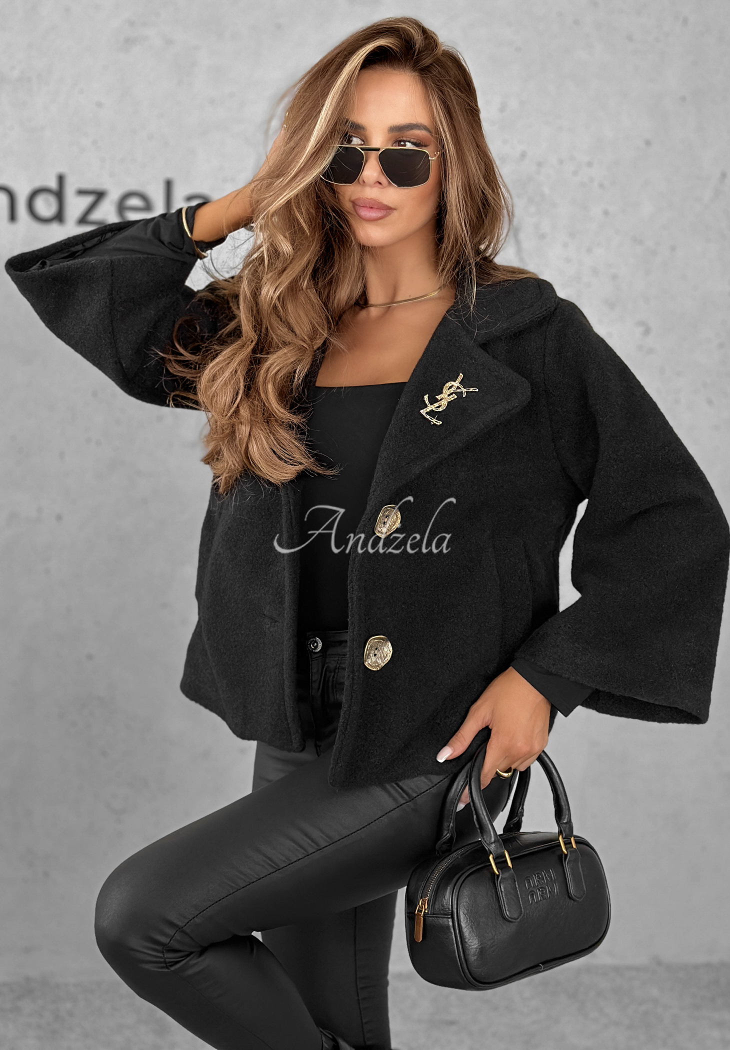 Kratší kabát z mäkkej látky. Má oversize strih a široké rukávy. Má golier a zapínanie na zlaté gombíky.