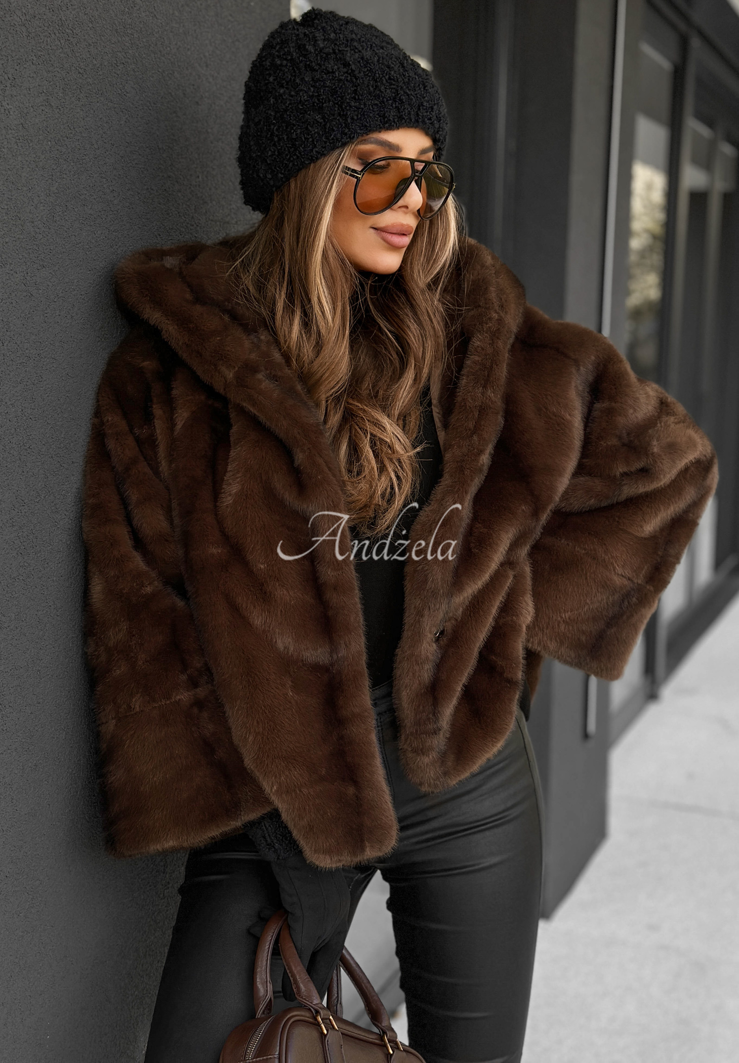 Mäkká, krátka bunda lemovaná syntetickou kožušinou. Tento model má kapucňu a strieborné zapínanie na patentný cvok. Má široké rukávy a funkčné predné vrecká.