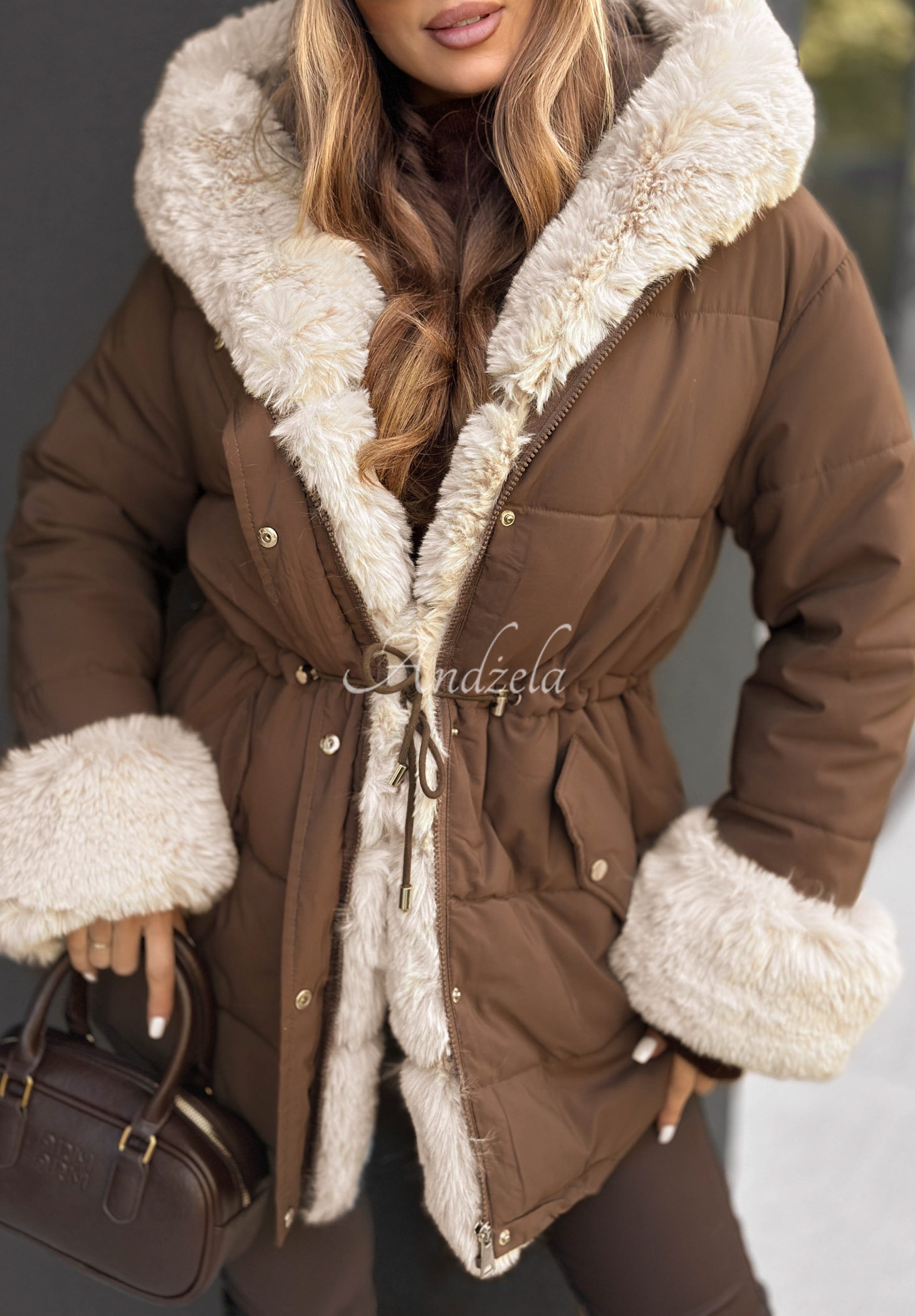 Teplá bunda s mäkkou, výraznou kožušinou a výplňou zo syntetického páperia. Táto prešívaná bunda s kapucňou, zapínaná na zips a patentné gombíky. Má funkčné vrecká na zips a sťahovaciu šnúrku v páse. Strieborné detaily dotvárajú look.