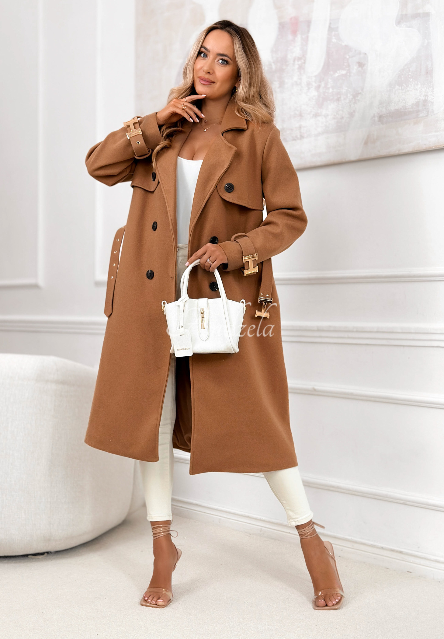 Dlhý dvojradový kabát s opaskom Changing Of Season ťavý
